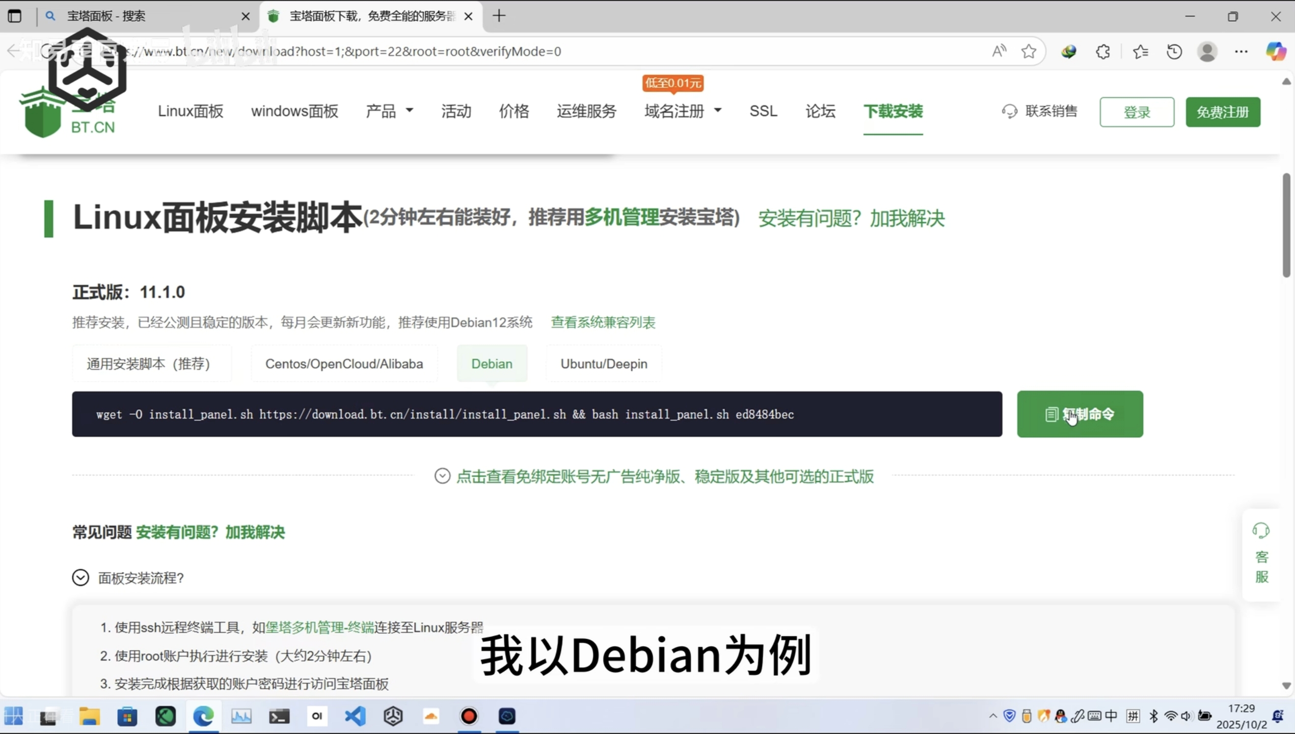 找到Linux免费版,点击获取安装脚本