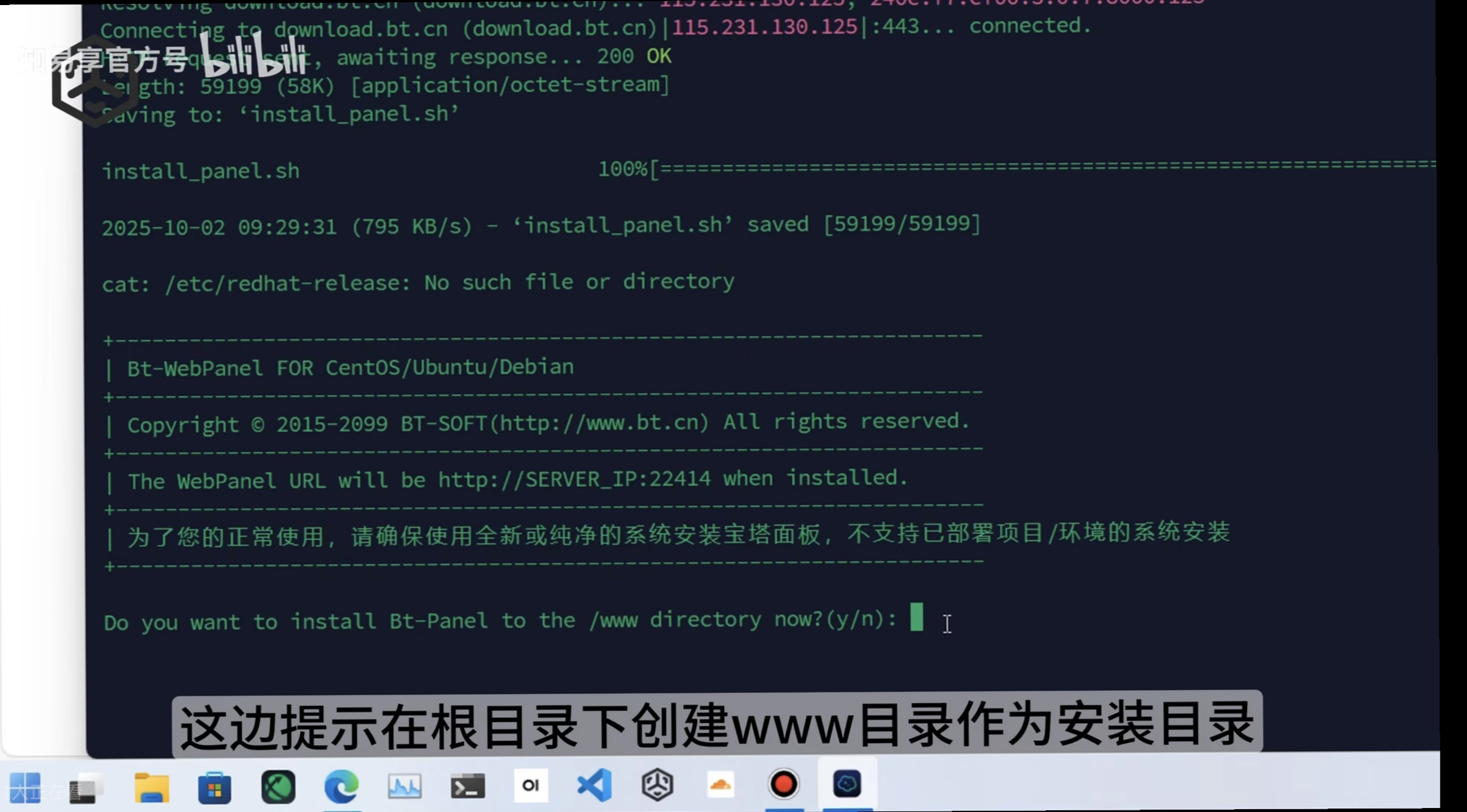 中途会提示一次,将面板安装到根目录下的www目录,输入y并回车即可