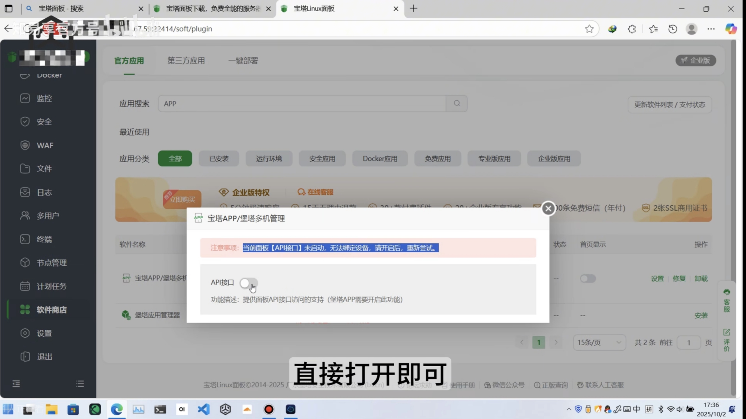 安装完成面板端软件后,我们点击设置,会提示未开启面板API接口,直接打开即可