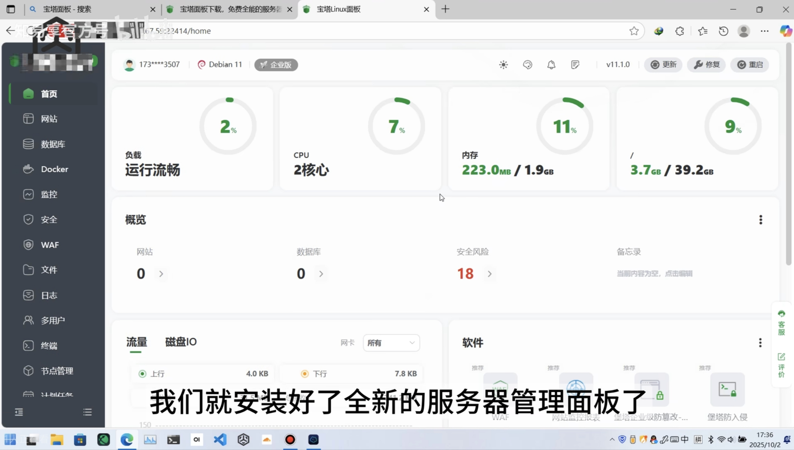 现在我们正式进入宝塔面板首页,在这里可以看见服务器的部分基本信息,不过每次都是用浏览器打开地址访问有时过于麻烦,那有没有什么更好的方法能快速访问面板呢?下面我们绑定宝塔APP,实现在手机APP上轻松访问面板